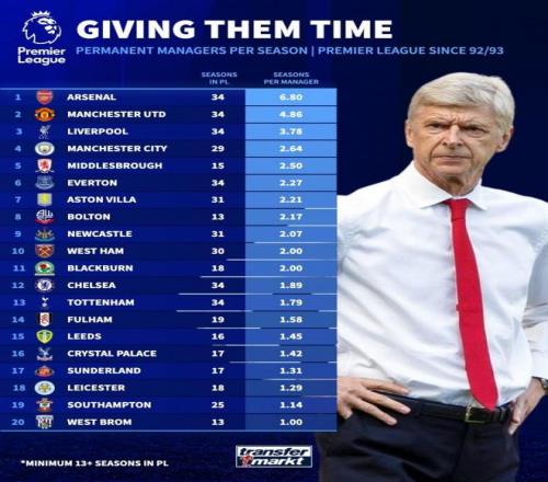 《转会市场》统计了英超各队的历任正式主教练平均执教年限情况,阿森纳无悬念居首的。
