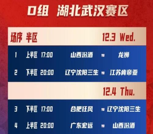 根据抽签分组的情况,广东队和山西队、广州龙狮队、江苏队、辽宁队以及合肥狂风队(NBL)共6支球队在D组。今年的杯赛小组赛分为上下两个半区,广东队和广州龙狮队、山西队在上半区;辽宁队和江苏队、合肥狂风队在下半区;今天首个比赛日广东队轮空,没有比赛任务,12月4日晚上20:00广东队对阵山西队,12月5日晚上20:00广东队对阵广州龙狮队。然后进行上下半区的交叉比赛,每个小组的前两名球队出线进入俱乐部杯赛的决赛阶段。