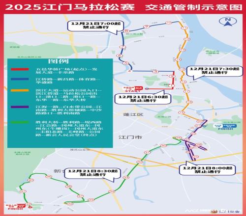 2025江门马拉松赛比赛起点设在五邑华侨广场,半程马拉松终点设在江海一路(白水带体育公园)、全程马拉松终点设在新会人民会堂。发布会上,江门市公安局治安支队副支队长杜宪国介绍,今年马拉松赛事,对赛道沿线及受影响的周边道路,将实施“分段管制、滚动封闭、分步解除”的交通管制方式。根据选手用时,公安部门分时分段对前方道路实施封闭管制,在解封阶段根据跑者队伍和收尾车辆通过情况,分段分步安全解除交通管制,最大限度压减交通管制时间,第一时间恢复道路正常通行。