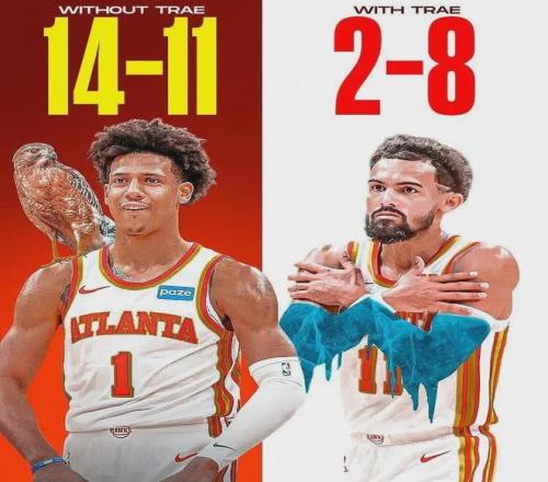 话说老鹰很幸运已经找到了新鹰王,即杰伦-约翰逊,本赛季至今场均24分10.2板8.5助1.4断,至于老鹰王特雷杨场均只有19.3分1.5板8.9助进账,当他出战时球队胜率20%,反之55.6%。
