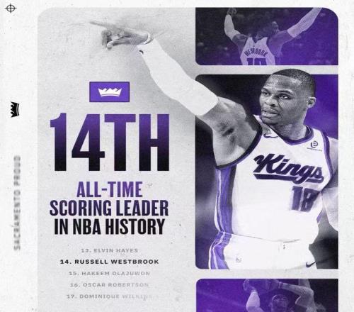威少常规赛总得分超越火箭名宿奥拉朱旺,升至NBA历史总得分榜第14位。