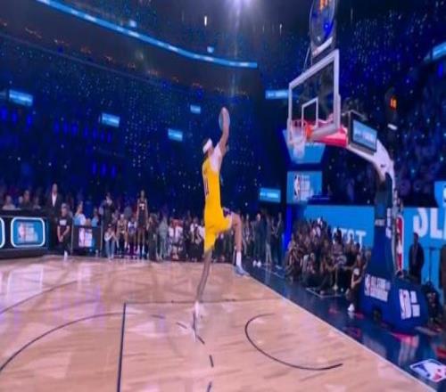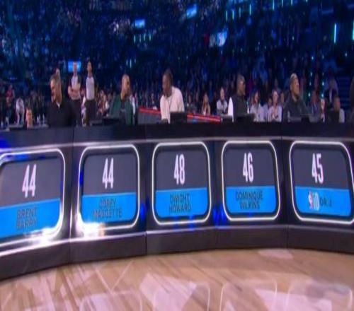 第二位登场的是两届扣篮王杰森-理查德森的儿子、魔术球员杰斯-理查德森,他从三分线外抛球,冲到禁区接球反弹完成拉杆小风车背扣得到45.4分。