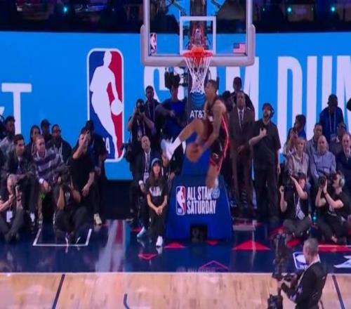 凯沙德-约翰逊决赛第二扣从后场开始启动,跑到罚球线以里起飞空中抡圆大风车暴扣得到47.8分,两扣合计得到97.4分。